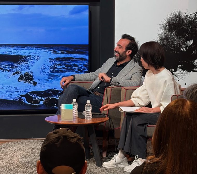 リオネルシェフが初めて平田シェフとお会いしたのは、2018年、コラボイベントの準備で能登に訪れた時でした。「能登の光と景色に心を奪われた。」それから撮り続けている多くの写真に、平田さんは「自分たちが素晴らしい土地に住んでいると改めて感じた」と言います。会場はリオネルシェフの写真が飾られ、また、4名の席の背面に大きく映し出されることで、参加された皆様は美しい海や神聖な森、木々を見ながらのトークとなりました。