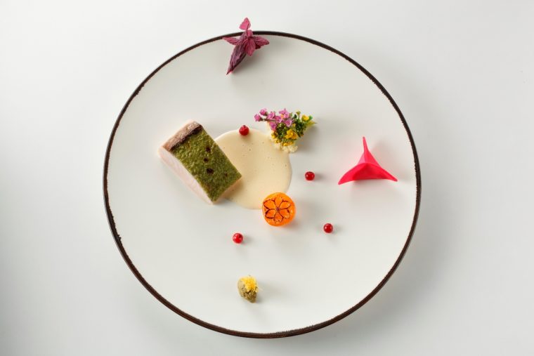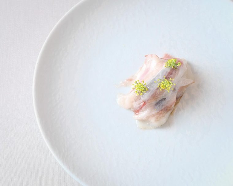塩水で漬けた佐賀のアマダイを揚げ、骨の透明なスープと肝を合わせました。 赤パプリカは、コンディモンで味付けしたオイルに優しく漬けて、フェタ、ゴーヤのソテー、豆、マジョラム、ガーリック、ビターなオリーブオイル、古いシェリー…